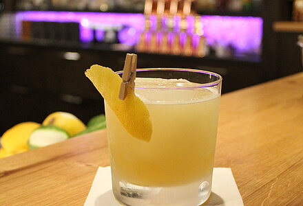 - Strain into a tumbler filled with solid ice cubes and garnish with a lemon zest.