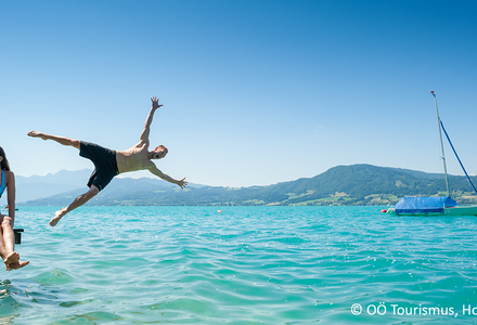 No less beautiful and somewhat quieter is the ‘Kohlbauernaufsatz’ bathing spot. It is a smaller bathing spot that isn’t immediately obvious at first glance. If you drive along Seestraße from Attersee towards Unterach, you’ll find it hidden amongst hedges and trees. Peace and relaxation reign here. Spread your towel out on the grass, let the gentle breeze blow across your face and enjoy the stunning view of the Höllengebirge, which stretches along the eastern shore of Lake Attersee. The ‘Kohlbauernaufsatz’ is at its most beautiful early in the morning, when the sun’s rays make the lake sparkle and glisten.