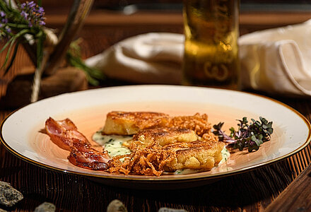 - Etwas Butterschmalz (Butter) in der Pfanne erhitzen und die Kaspressknödel auf beiden Seiten goldbraun backen