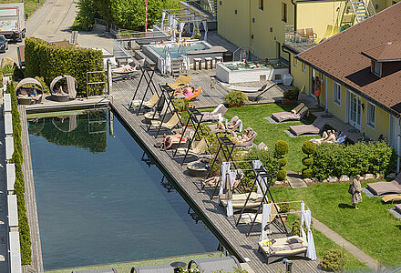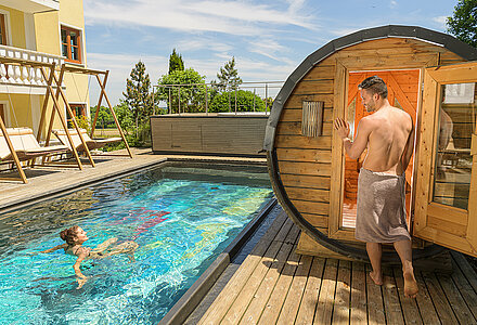 Das Hotel Winzer ist ja nicht nur Kuschel-, sondern auch Wellnesshotel. Da wollen wir unseren Gästen auch in diesem Bereich nur das Beste bieten. Unser Freibad ist ein beliebter Ort im Außenbereich. Auch hier sind wir immer um höchsten und zeitgemäßen Standard bemüht. Daher wurde auch das Freibad modernisiert und neu gestaltet. Es ist nun in edles Anthrazit gehüllt. Kleines Highlight ist ein 3D-Bild am Beckenboden. Damit Haut und Auge was davon haben. Als besonderes Extra haben wir in diesem Bereich auch einen Whirlpool und eine kleine Outdoor-Sauna eingerichtet. Entspannung findet man bei uns halt in vielen Facetten.