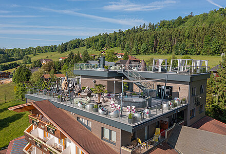 Auch wenn unsere Zimmer noch so schön sind, irgendwann muss man auch mal raus. Vor allem wenn die Sonne strahlt. Ein perfekter Ort dafür ist immer ganz oben über den Dingen. Im Hotel Winzer haben wir vor zehn Jahren zwei Stockwerke für himmlische Aussichten und Sonnenhungrige errichtet. Nun war die Zeit reif für Modernisierungsmaßnahmen. Das Sonnendeck in der fünften und der FKK-Bereich in der sechsten Etage haben wir neu gestaltet. Neu sind Steinfliesen statt Holzboden, zwei brandneue Whirlpools zum Relaxen und die neue Skybar mit besten Cocktails unserer Bartender. Bei Schönwetter wird man hier auch einen Sundowner mit herrlichem Panoramablick über den Attergau genießen können. Wer noch nicht genug von Hochgefühlen hat, wird sie hier finden.