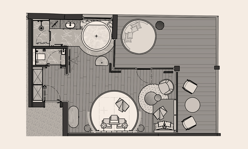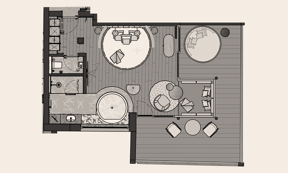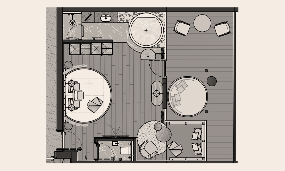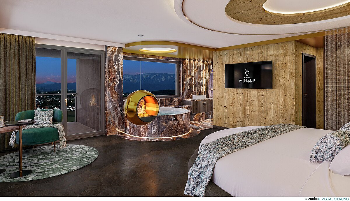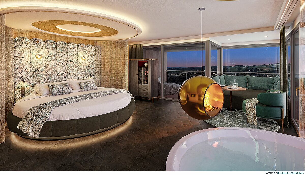 Der offen gestaltete Wohnraum wirkt ruhig und klar. Das Rundbett bildet den Mittelpunkt, der runde Whirlpool für zwei ergänzt den Raum. Der Kamin mit Effektfeuer bringt stimmungsvolles Licht in den Abend.