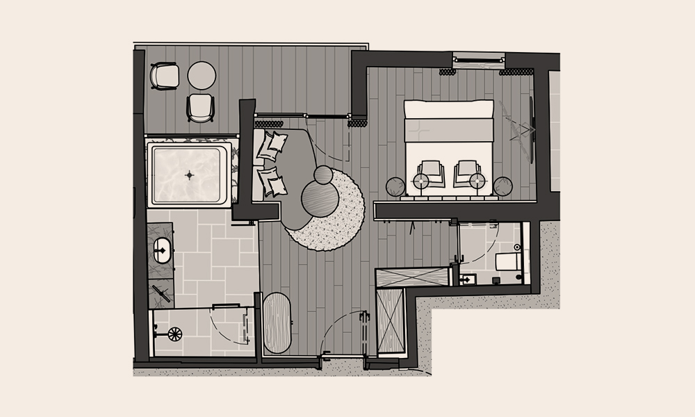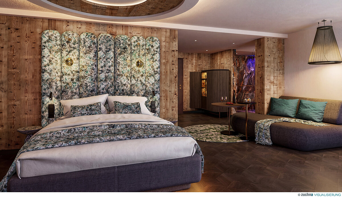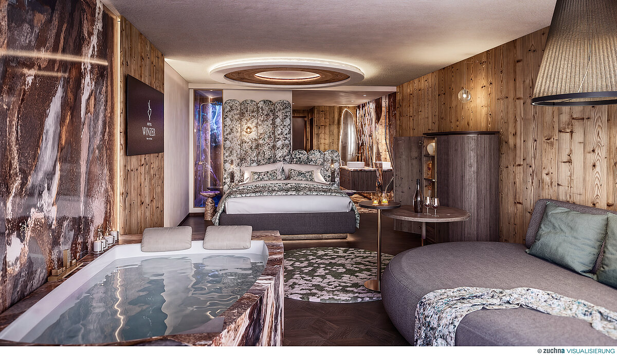Der offen gestaltete Wohn- und Schlafbereich wirkt kompakt und stimmig. Das Bett steht im Mittelpunkt, der eckige Whirlpool für zwei ergänzt den Raum selbstverständlich.