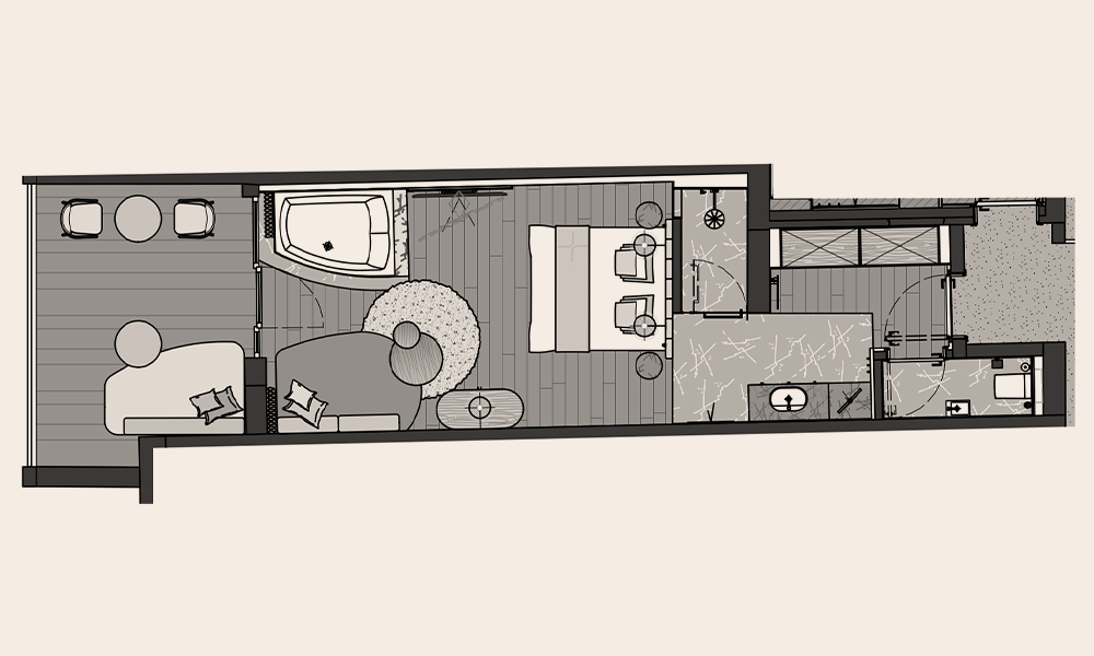 Eichenholzboden verleiht der Suite ihre warme Basis.