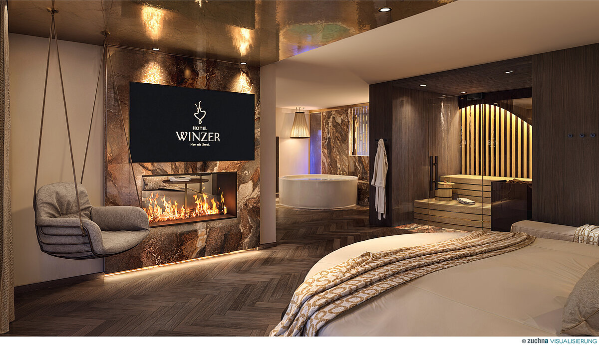Der Kamin mit Effektfeuer bringt Wärme und Tiefe in den Abend. Die integrierte Sauna macht diese Suite zu einem privaten Rückzugsort. Ganz für sich.
