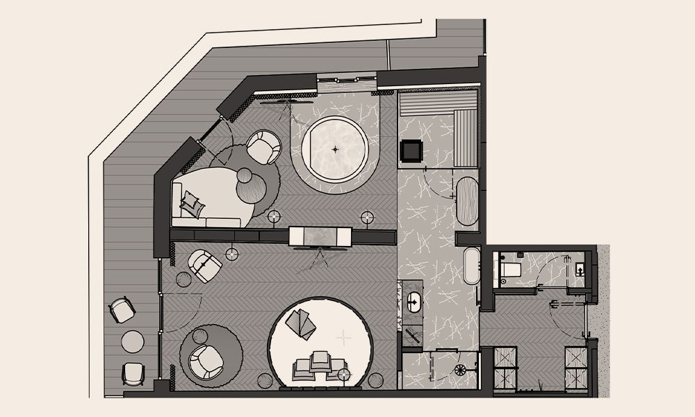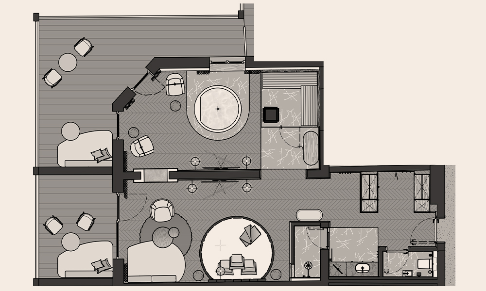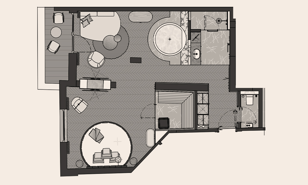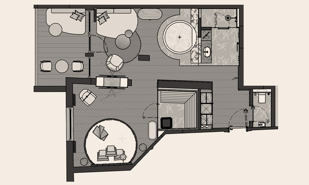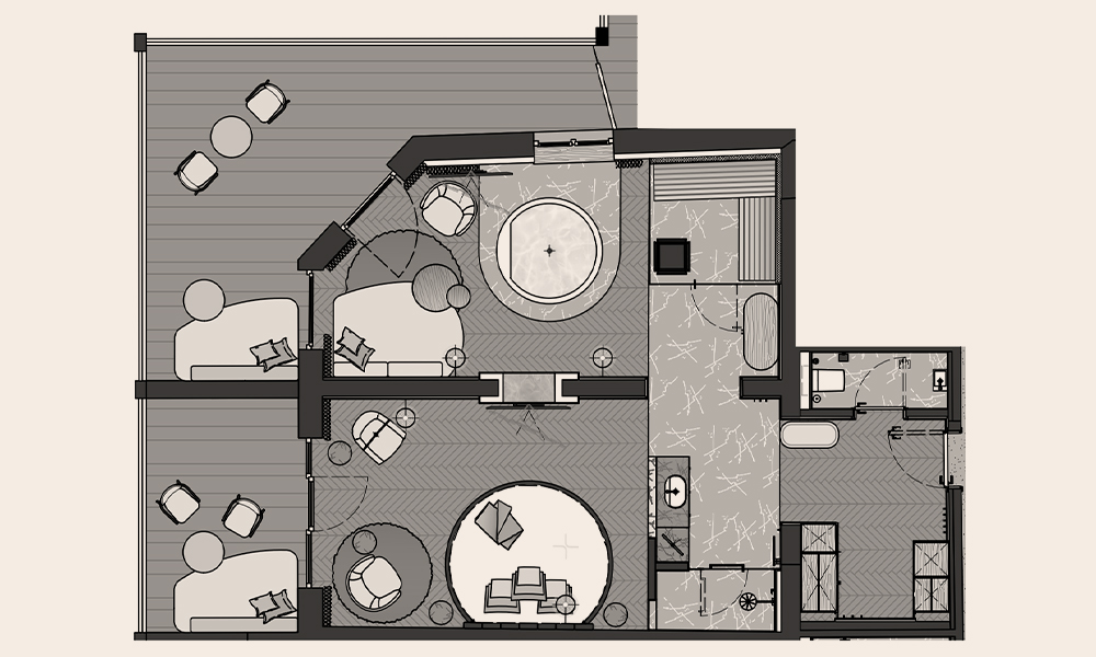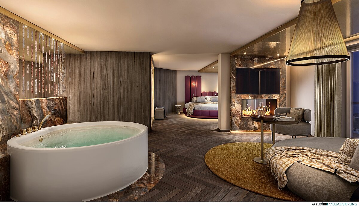 Der Wohnbereich öffnet sich großzügig. Der runde Whirlpool steht präsent im Raum und wird zum Mittelpunkt gemeinsamer Momente. Im Hintergrund liegt das Rundbett ruhig und geschützt.